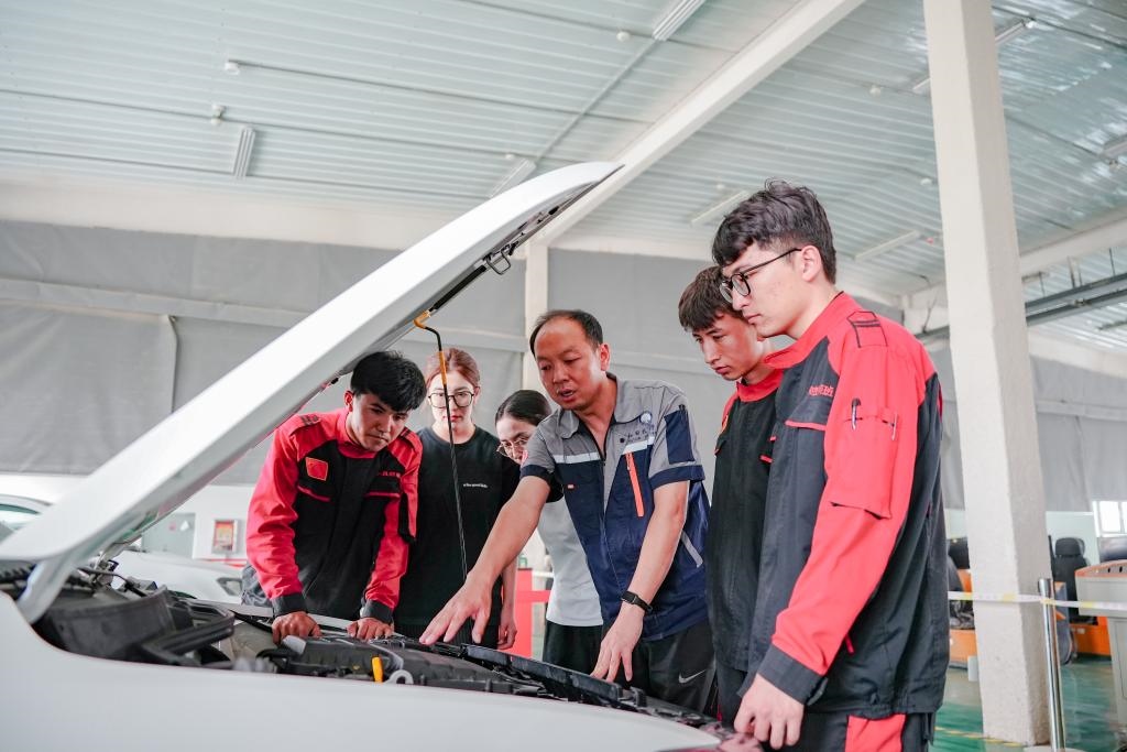 2025年6月27日,在新疆和田技師學(xué)院,北京援疆教師李寶(右三)和當(dāng)?shù)亟處熞煌笇?dǎo)學(xué)生維修汽車。新華社記者 徐宏巖 攝
