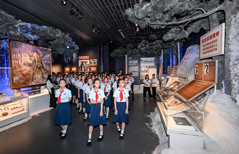 7月7日,北京市第十二中學(xué)的少先隊(duì)員在中國人民抗日戰(zhàn)爭紀(jì)念館向抗戰(zhàn)英烈獻(xiàn)花。
