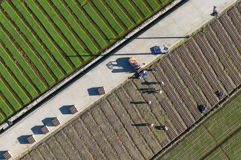 7月7日,浙江省余姚市黃家埠鎮(zhèn)上塘村農(nóng)民在田間擺放晚稻秧盤(無(wú)人機(jī)照片)。