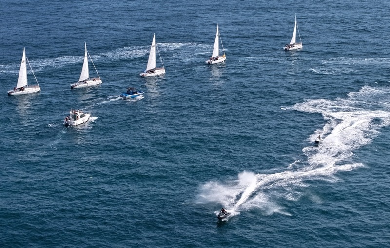 青島小麥島附近海域,市民和游客乘坐帆船參加海上巡游活動(dòng)(7月10日攝,無(wú)人機(jī)照片)。