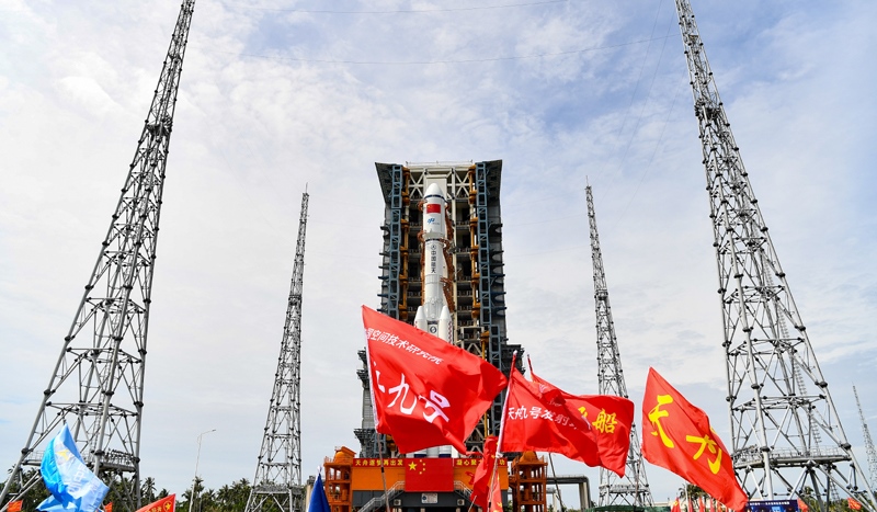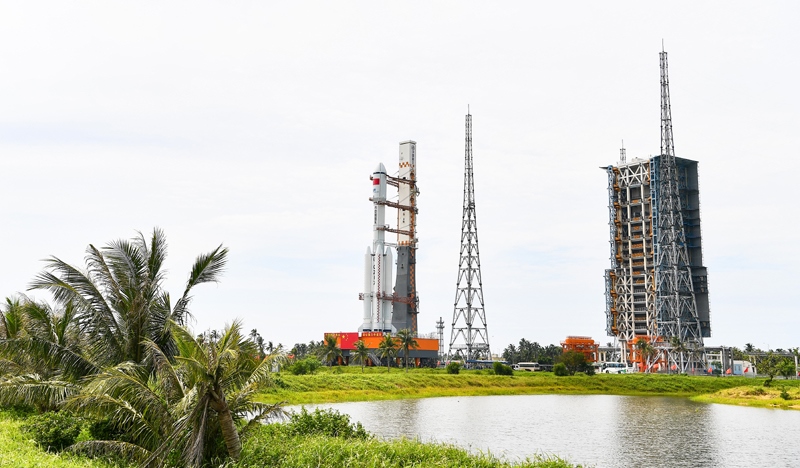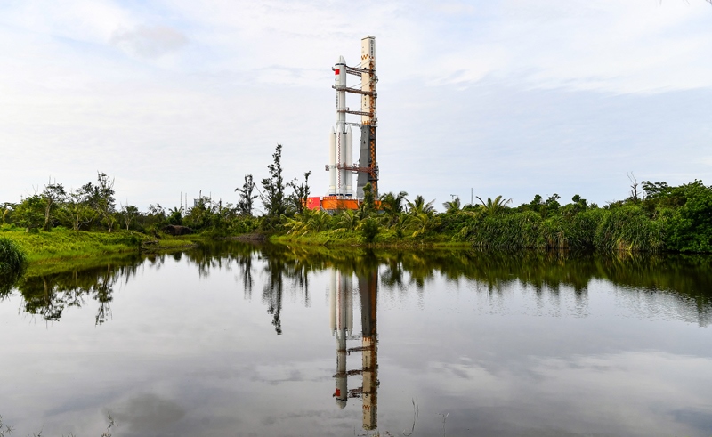 7月12日,天舟九號貨運飛船與長征七號遙十運載火箭組合體垂直轉運中。