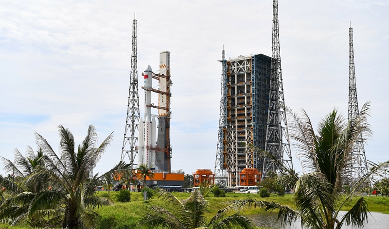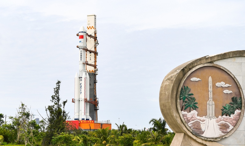 7月12日,天舟九號貨運飛船與長征七號遙十運載火箭組合體垂直轉運至發(fā)射區(qū)。