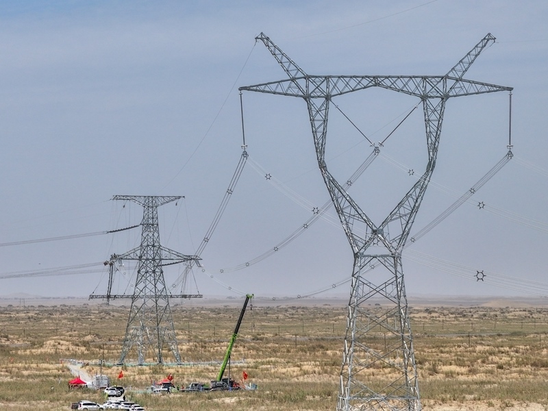 這是建設中的巴州-鐵干里克-若羌750千伏輸變電工程(2024年8月13日攝)。