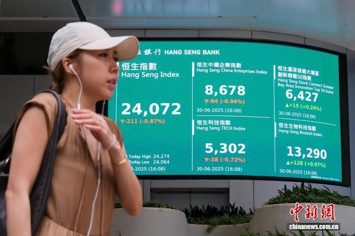 7月29日,香港交易及結(jié)算所有限公司表示,今年上半年,其全資附屬公司香港聯(lián)合交易所有限公司平均每日成交金額達2402億港元,同比增長118%。圖為6月30日,2025年上半年最后一個交易日,香港恒生指數(shù)收市報24072.28點。(資料圖) 中新社記者 陳永諾 攝
