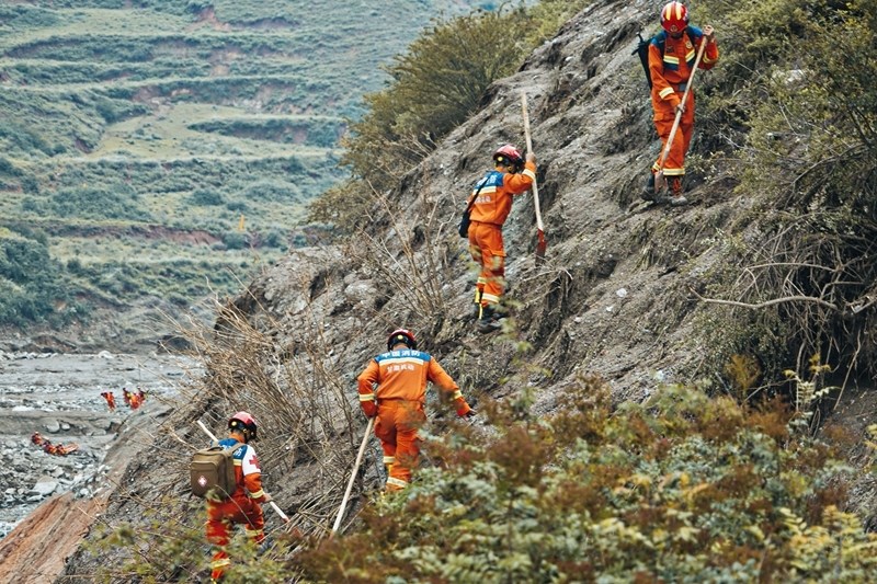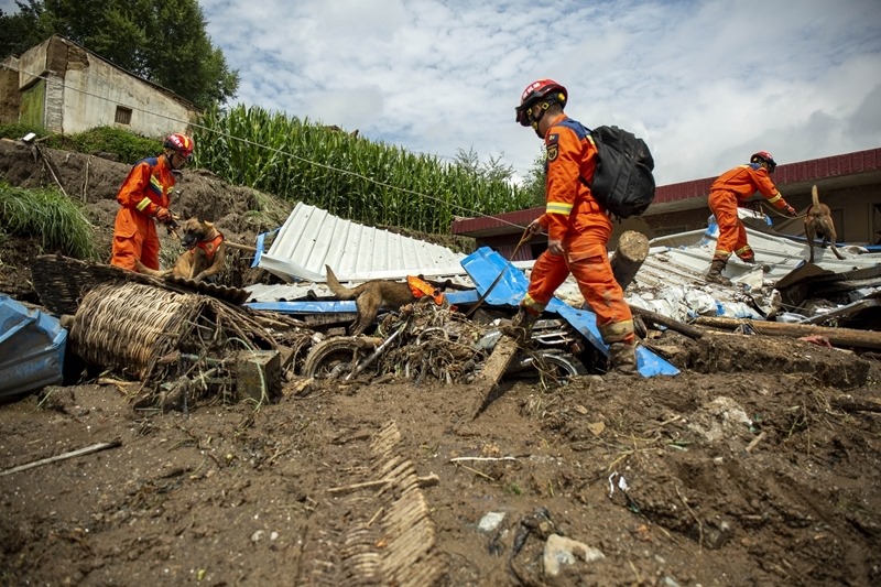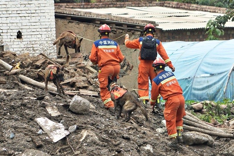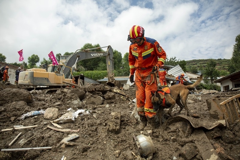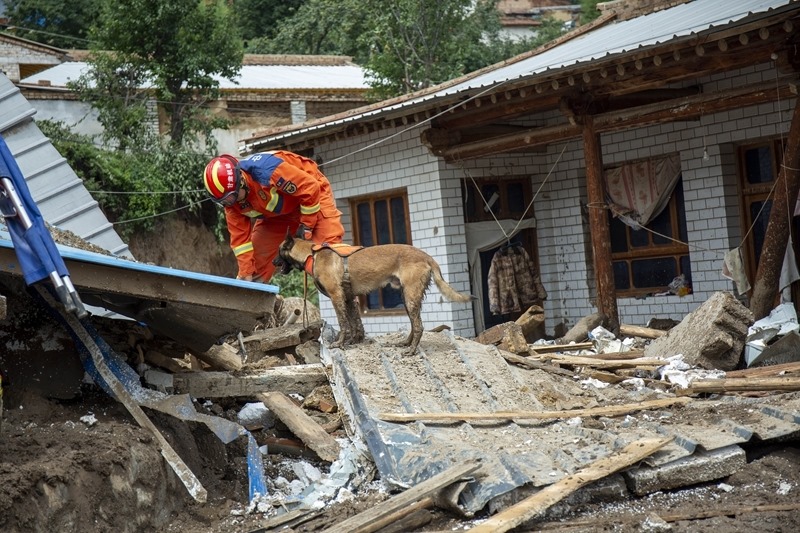 8月9日,國家西北區(qū)域應(yīng)急救援中心指戰(zhàn)員在馬坡鄉(xiāng)舊莊溝村攜帶搜救犬配合大型機(jī)械搜救失聯(lián)人員。