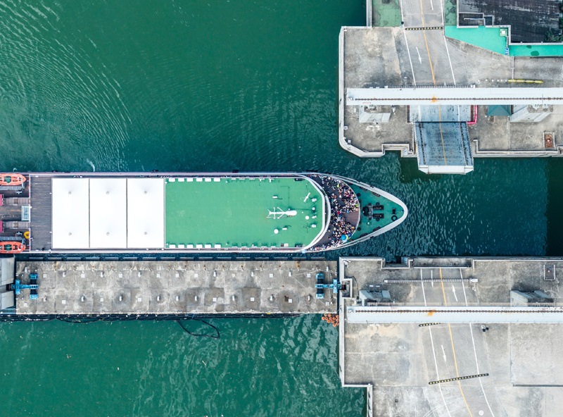 8月16日,在湖北省宜昌市,下行游船長(zhǎng)江三峽5號(hào)通過(guò)三峽升船機(jī)(無(wú)人機(jī)照片)。