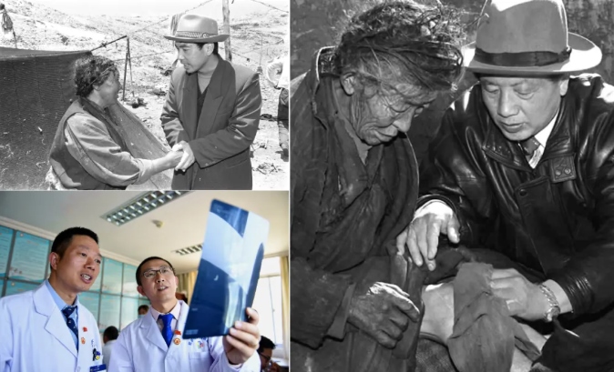 左上圖為來自陜西的援藏干部、阿里日土縣副縣長賈冗勇深入牧區(qū),幫助藏族牧民解決生產、生活的實際困難(新華社記者土登攝,1997年11月11日發(fā));左下圖為2017年8月3日,北京積水潭醫(yī)院援藏醫(yī)生龔曉峰(右)和北京天壇醫(yī)院援藏醫(yī)生李家謀在拉薩市人民醫(yī)院骨科病房內查看患者的X光片(新華社記者晉美多吉攝);右圖為孔繁森(右)在阿里日土縣過巴鄉(xiāng)為孤寡老人益西卓瑪治?。ㄐ氯A社記者土登攝,1994年12月26日發(fā))。