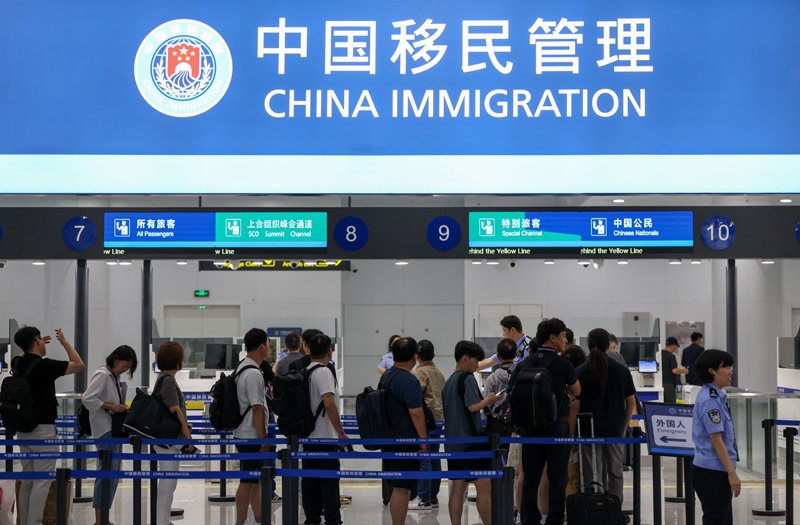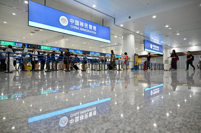 8月27日,在天津?yàn)I海國際機(jī)場(chǎng)T1航站樓,旅客排隊(duì)入境查驗(yàn)。