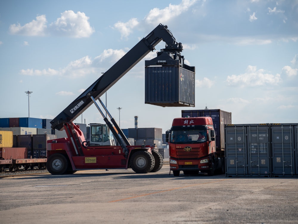 2025年7月14日,長(zhǎng)春興隆鐵路口岸作業(yè)區(qū)內(nèi)的吊裝車將集裝箱裝載到卡車上。新華社記者 邵澤東 攝