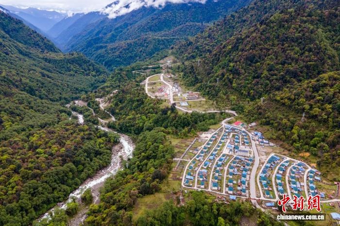 資料圖為2021年5月16日,航拍西藏墨脫縣扎墨公路沿線的貢日村,該村為舊扎墨公路80K處,是一處物資轉(zhuǎn)運點。江飛波 攝
