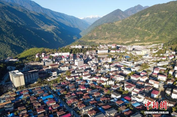 圖為2023年12月19日,航拍西藏扎墨公路通車10年后的墨脫縣城。江飛波 攝