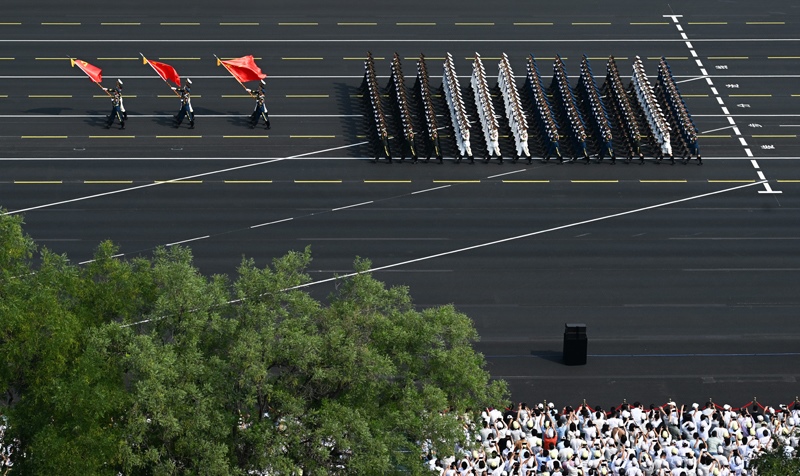 9月3日,紀念中國人民抗日戰(zhàn)爭暨世界反法西斯戰(zhàn)爭勝利80周年大會在北京隆重舉行。這是國旗護衛(wèi)隊在天安門廣場列隊。