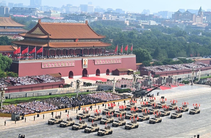 9月3日,紀念中國人民抗日戰(zhàn)爭暨世界反法西斯戰(zhàn)爭勝利80周年大會在北京隆重舉行。這是信息支援方隊通過天安門廣場。