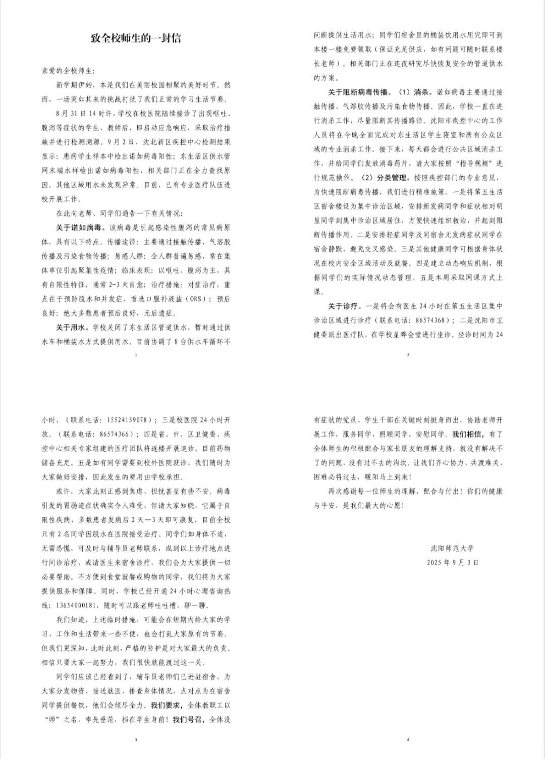 9月3日,沈陽師范大學(xué)發(fā)布的《致全校師生的一封信》(以下簡稱“《一封信》”)中稱,8月31日14時許,學(xué)校在校醫(yī)院陸續(xù)接診了出現(xiàn)嘔吐、腹瀉等癥狀的學(xué)生、教師。相關(guān)部門正在全力查找原因,目前已有專業(yè)醫(yī)療隊(duì)伍進(jìn)校開展工作。