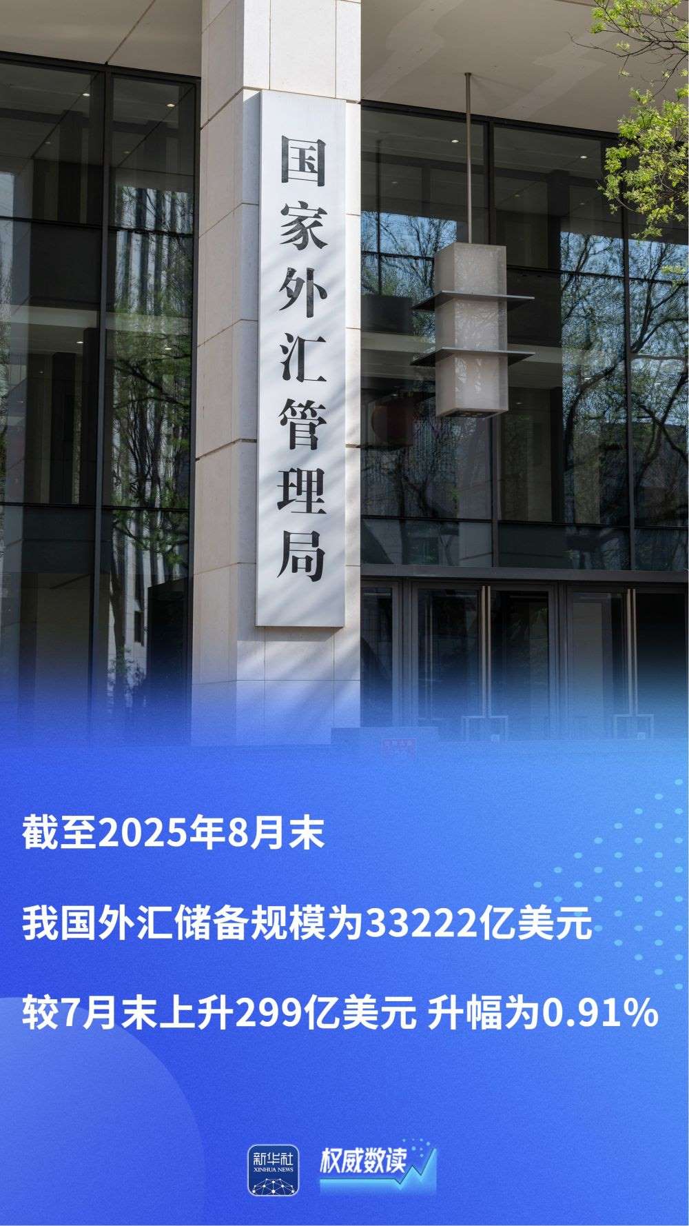 國家外匯管理局數(shù)據(jù)顯示,截至2025年8月末,我國外匯儲備規(guī)模為33222億美元,較7月末上升299億美元,升幅為0.91%。