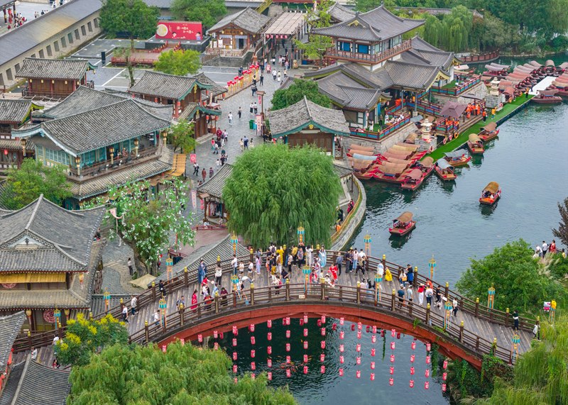 10月5日,游客在湖北省襄陽市唐城景區(qū)游玩(無人機(jī)照片)。