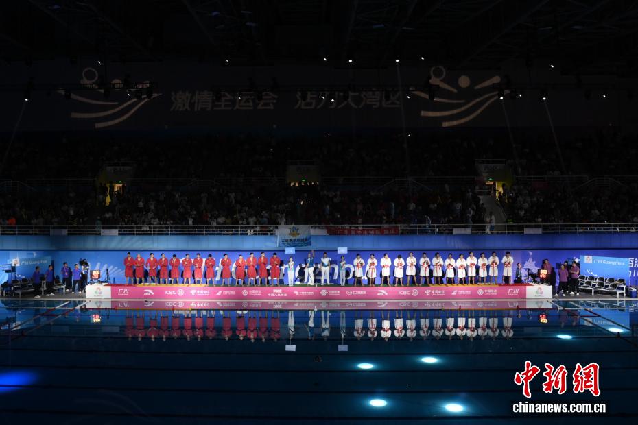 10月27日晚,在廣東廣州舉行的第十五屆全國運(yùn)動(dòng)會(huì)水球男子組比賽金牌賽中,廣東隊(duì)(紅衣)以16比9戰(zhàn)勝上海隊(duì)(白衣),獲得金牌。圖為雙方運(yùn)動(dòng)員出場。