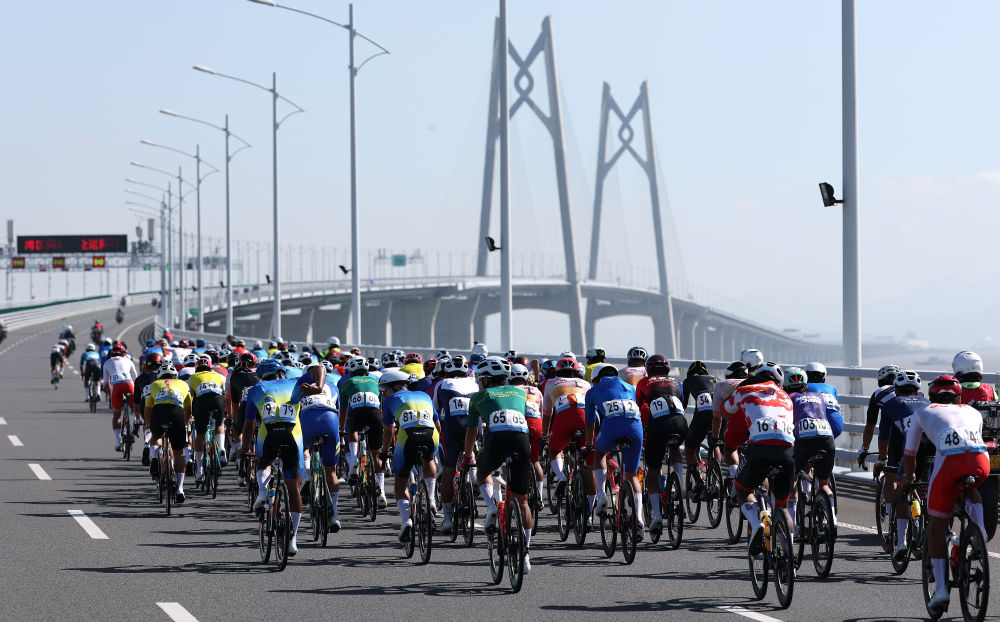 11月8日,參賽選手在港珠澳大橋騎行。當日進行的第十五屆全國運動會公路自行車男子個人賽,賽道全程231.8公里,選手經過港珠澳大橋,跨越粵港澳三地。這是全運會歷史上首次舉辦跨境比賽。新華社記者 毛思倩 攝