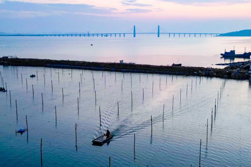 ↑ 11月10日,在山東省榮成市桑溝灣海洋牧場,養(yǎng)殖工人在養(yǎng)殖區(qū)穿梭作業(yè)(無人機(jī)照片)。新華社發(fā)(王福東 攝)