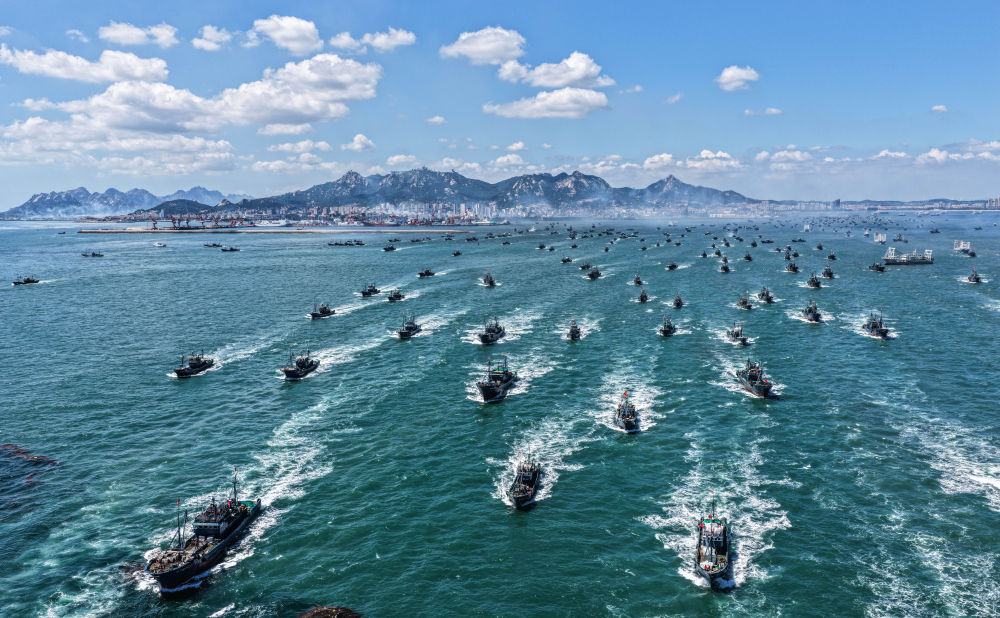 ↑ 在山東省榮成市石島漁港,黃渤海休漁期結(jié)束后,漁民駕駛漁船出海作業(yè)(9月1日攝,無人機(jī)照片)。新華社發(fā)(李信君 攝)