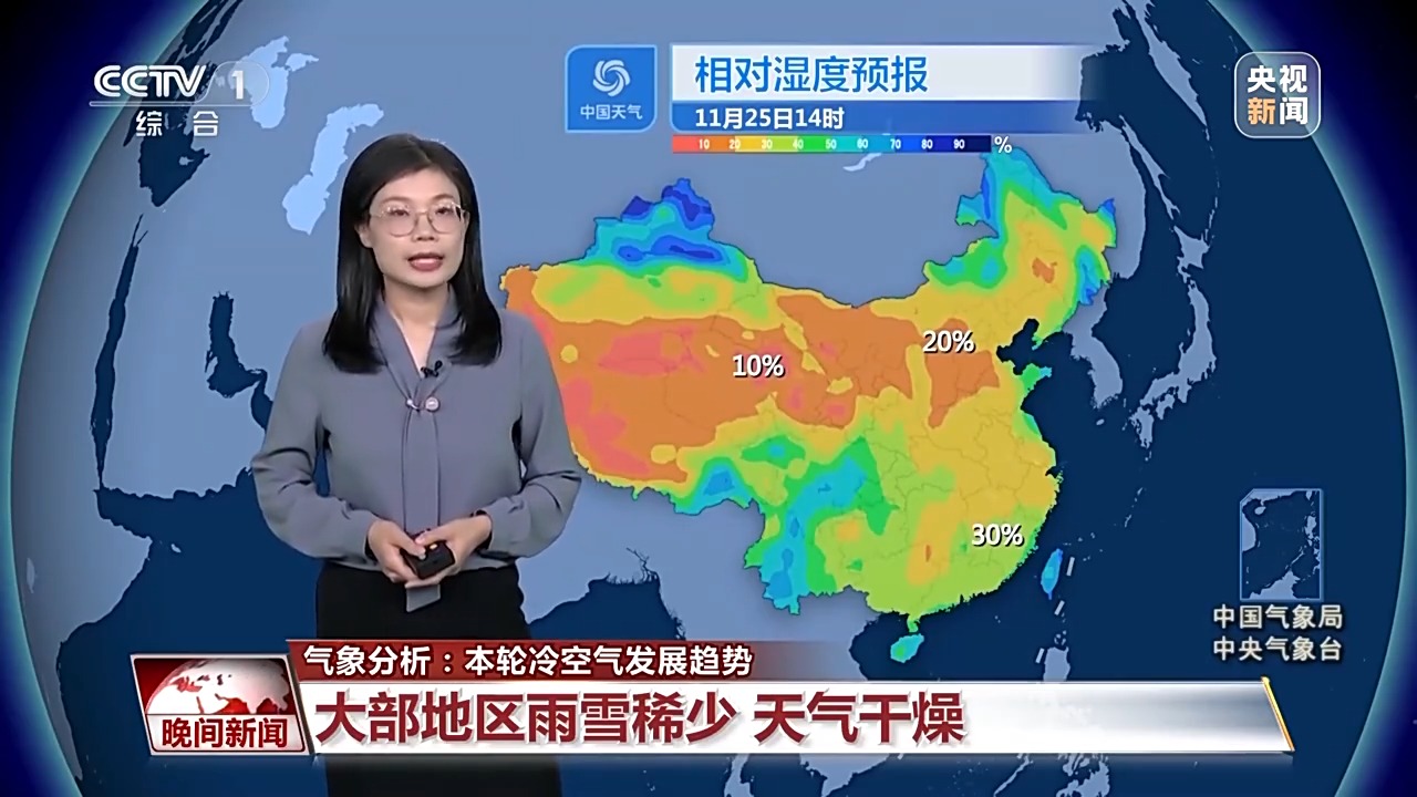 冷空氣帶來的雨雪并不多,而且在偏北風(fēng)吹拂之下,天氣會非常干燥。像是西北華北等地,午后的相對濕度可能只有20%左右,局部地區(qū)甚至不足10%,就連南方相對濕度也只有30%上下,所以整體都會是比較干燥的狀態(tài),大家要及時補充水分,并且注意用火安全。