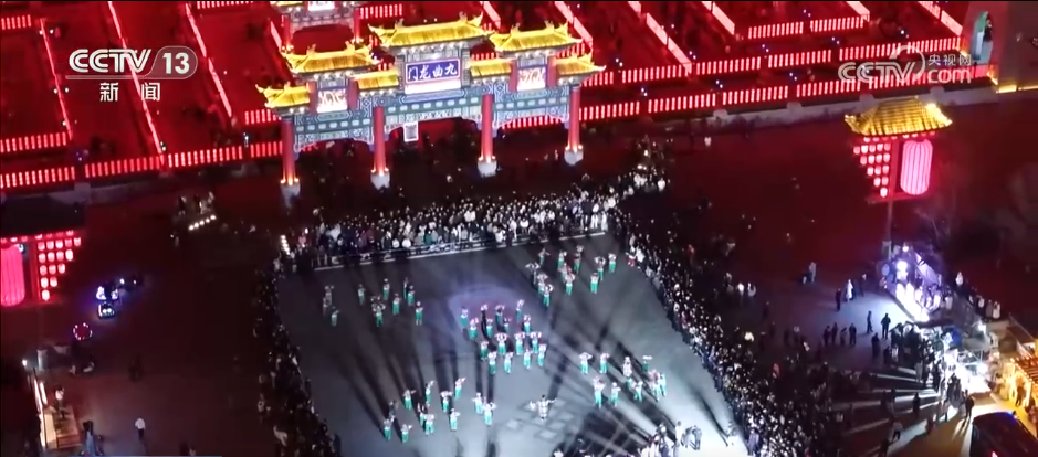 九曲燈陣占地面積近20畝,外部方正、內(nèi)部曲折,宛如“九曲十八彎”的黃河。游客們跟隨奏樂隊(duì)伍,進(jìn)入九宮九格的迷宮,穿行全長(zhǎng)2.4公里的回廊,依次走過(guò)寓意著“福祿壽喜”的九個(gè)曲陣。兩邊的燈籠上懸掛著百家姓和十二生肖,游客們可以一邊轉(zhuǎn)九曲,一邊尋找印有自己姓氏和屬相的紅燈籠,沉浸式體驗(yàn)元宵佳節(jié)的喜慶氛圍。除了九曲燈陣,社火展演、主題光影秀、無(wú)人機(jī)煙花秀也輪番上演。據(jù)了解,該活動(dòng)將一直持續(xù)到正月十五。