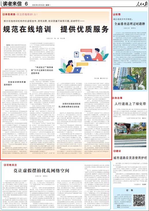 根據(jù)網(wǎng)友反饋的問(wèn)題,6月26日,人民日?qǐng)?bào)讀者來(lái)信版“來(lái)信調(diào)查”欄目刊發(fā)在線培訓(xùn)調(diào)查報(bào)道《規(guī)范在線培訓(xùn) 提供優(yōu)質(zhì)服務(wù)》,文中多處引用了人民網(wǎng)“人民投訴”平臺(tái)用戶相關(guān)案例和線索。