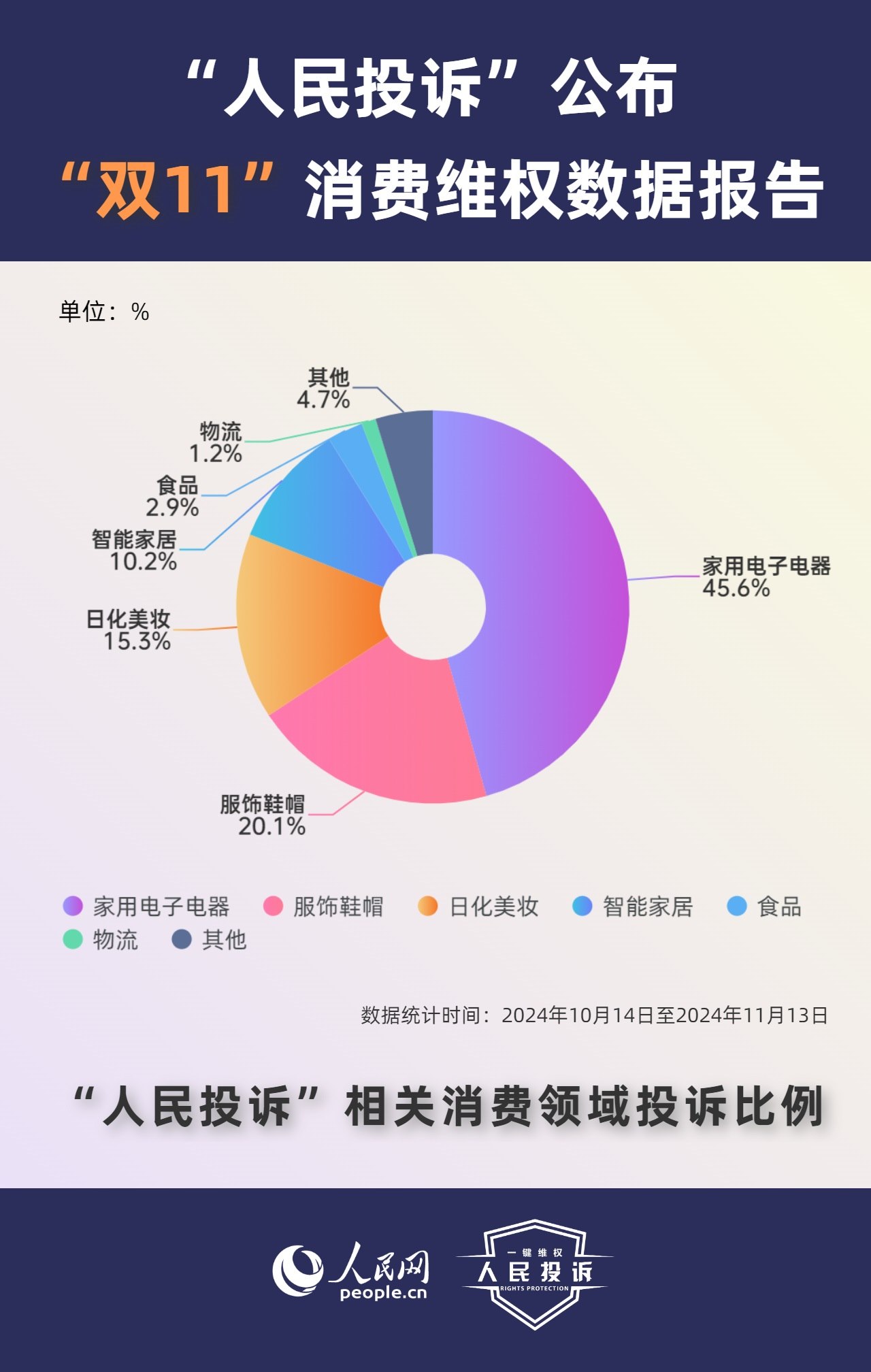 那么,今年你的“雙11”購物還遇到了哪些“套路”?據(jù)人民網(wǎng)“人民投訴”平臺統(tǒng)計,“雙11”期間平臺共收到17699條(數(shù)據(jù)統(tǒng)計從2024年10月14日-11月13日)投訴信息。其中,手機、家電、智能產(chǎn)品、美妝服飾等消費領(lǐng)域維權(quán)量大;平臺“國補”“以舊換新”等優(yōu)惠規(guī)則不透明,保價服務(wù)藏“貓膩”,直播間虛假“破價”,“百億補貼”商品貨不對板,“高價預(yù)售”欺詐等問題反映突出。