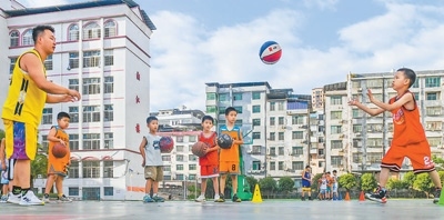 湖南省永州市道縣樹湘學(xué)校籃球訓(xùn)練營,孩子們在參加籃球訓(xùn)練。蔣克青攝(新華社發(fā))