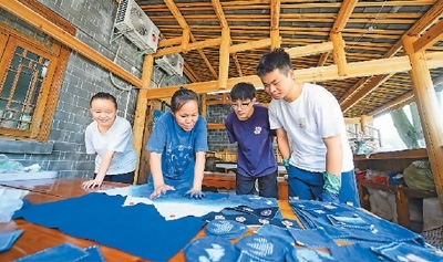 在貴州省黔東南苗族侗族自治州榕江縣三寶侗寨,來自貴州財經(jīng)大學(xué)的大學(xué)生學(xué)習(xí)非遺藍染知識。周光勝攝(人民圖片)