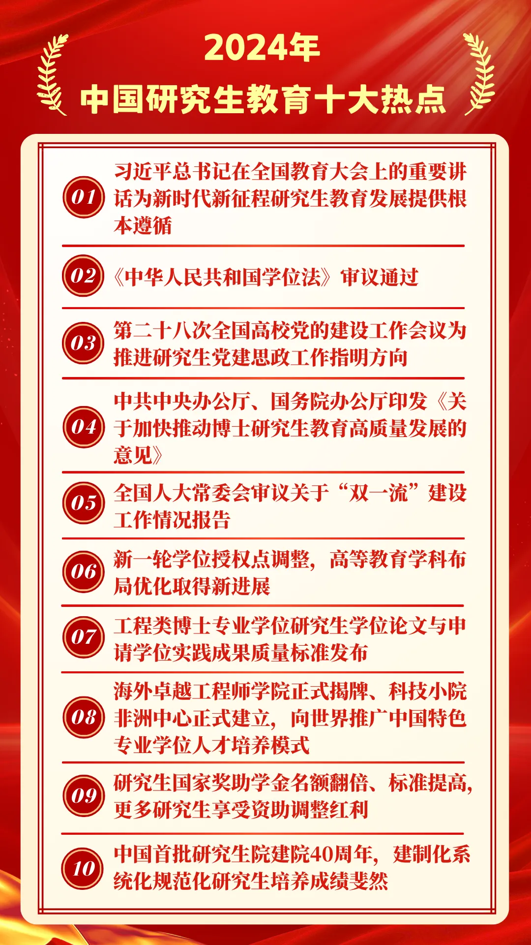 2024年,是中國學位與研究生教育發(fā)展史上具有重要里程碑意義的一年,在教育部學位管理與研究生教育司指導下,教育部學位與研究生教育發(fā)展中心《中國研究生》雜志回顧總結(jié)全年研究生教育大事要事和熱點動態(tài),聯(lián)合人民網(wǎng)、新華網(wǎng)、中國教育報和有關(guān)研究生教育媒體等共同發(fā)布2024年中國研究生教育十大熱點。