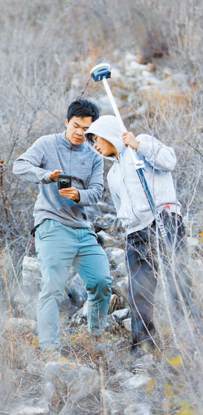 北京聯(lián)合大學地理學碩士研究生在北京房山區(qū)穆家口古城址四普現場測量文物地理坐標。