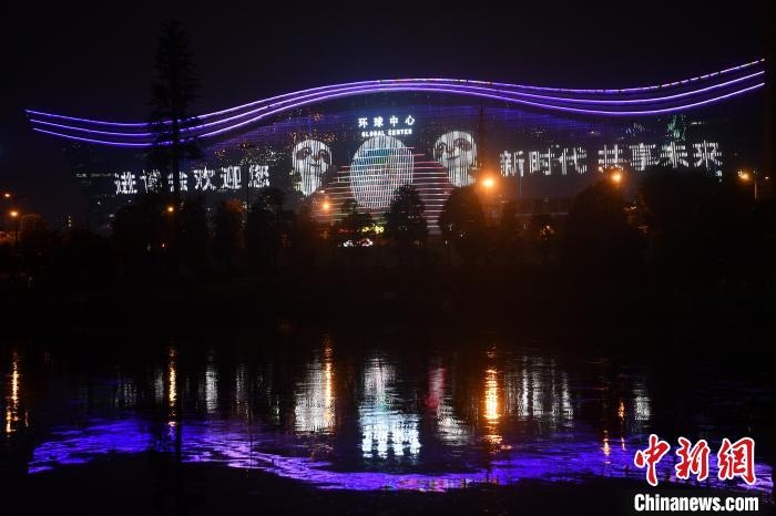 成都環(huán)球中心被第三屆中國(guó)國(guó)際進(jìn)口博覽會(huì)標(biāo)語(yǔ)“點(diǎn)亮”。 張浪 攝