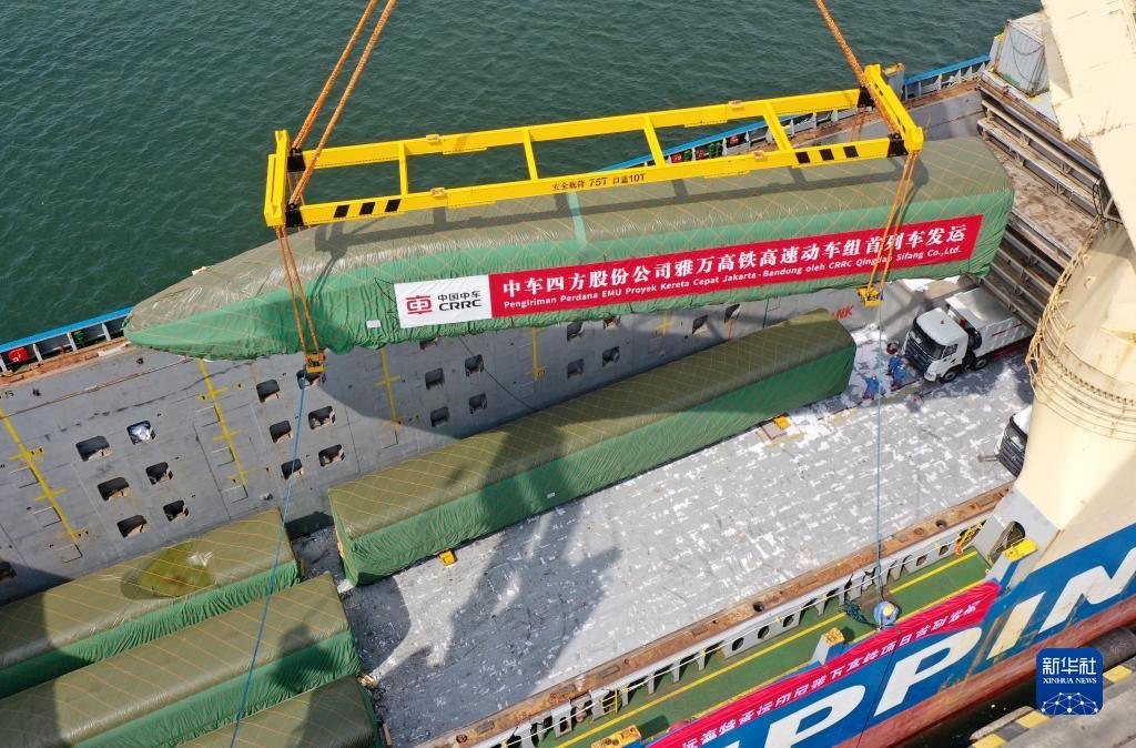 雅萬高鐵高速動車組在山東港口青島港裝船(8月18日攝,無人機照片)。新華社發(fā)(姜超 攝)