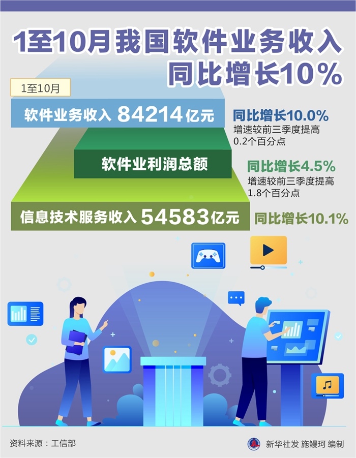 記者24日從工信部獲悉,1至10月,我國軟件和信息技術(shù)服務(wù)業(yè)運(yùn)行態(tài)勢平穩(wěn)向好,軟件業(yè)務(wù)收入84214億元,同比增長10.0%,增速較前三季度提高0.2個百分點(diǎn)。