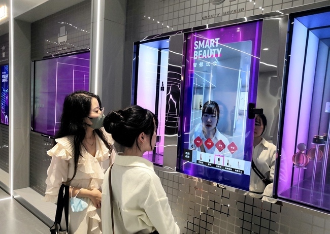 參觀者體驗(yàn)智慧試妝系統(tǒng)。人民網(wǎng)記者 孫博洋攝