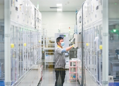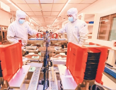 2023年2月16日,在安徽省馬鞍山市經(jīng)濟開發(fā)區(qū)檳城電子有限公司半導體芯片生產(chǎn)線上,職工在趕制應用于5G基站上的半導體芯片。王文生攝(人民圖片)