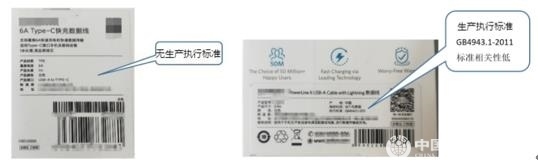 5.46款樣品有36款明示了生產(chǎn)執(zhí)行標(biāo)準(zhǔn),10款未明示生產(chǎn)執(zhí)行標(biāo)準(zhǔn)。明示的標(biāo)準(zhǔn)絕大多數(shù)為企業(yè)標(biāo)準(zhǔn),少數(shù)為已過時(shí)效期的行業(yè)標(biāo)準(zhǔn),或與數(shù)據(jù)線產(chǎn)品無相關(guān)性的安全標(biāo)準(zhǔn)。