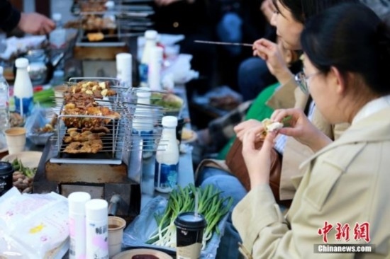 山東淄博,食客正在享用燒烤。 中新社記者 梁犇 攝
