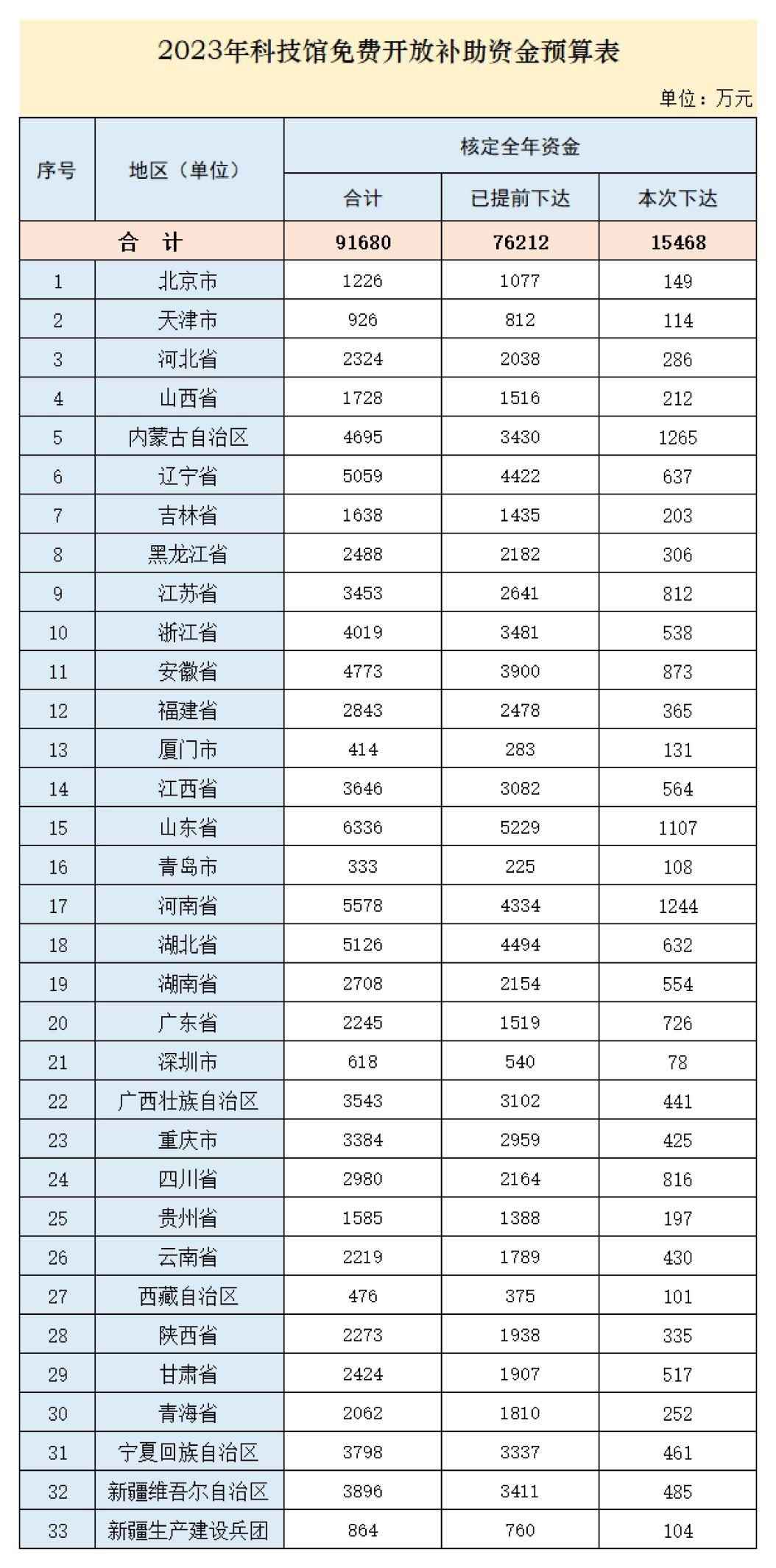 人民網(wǎng)北京5月10日電 (記者任妍)記者從財(cái)政部獲悉,為保障免費(fèi)開放科技館正常運(yùn)轉(zhuǎn),經(jīng)研究,現(xiàn)下達(dá)2023年科技館免費(fèi)開放補(bǔ)助資金預(yù)算,統(tǒng)籌用于各?。▍^(qū)、市)及新疆生產(chǎn)建設(shè)兵團(tuán)2023年免費(fèi)開放科技館門票減收補(bǔ)助、運(yùn)行保障增量補(bǔ)助及展品更新補(bǔ)助等方面。數(shù)據(jù)顯示,全國(guó)核定預(yù)算91680萬元,提前下達(dá)76212萬元,此次下達(dá)15468萬元。