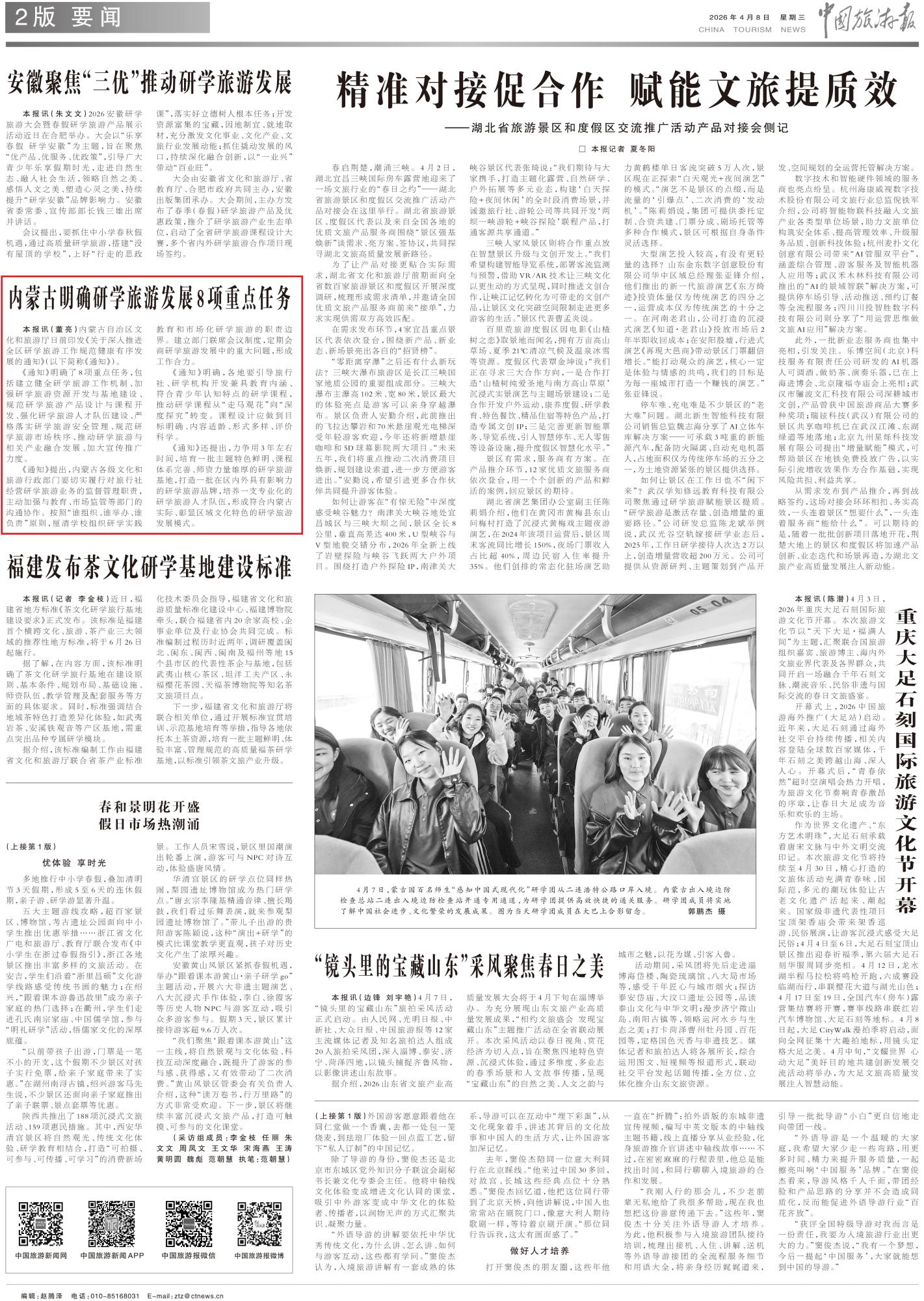 2026年4月8日《中國旅游報(bào)》2版刊發(fā)題為《內(nèi)蒙古明確研學(xué)旅游發(fā)展8項(xiàng)重點(diǎn)任務(wù)》的文章,報(bào)道了內(nèi)蒙古自治區(qū)文化和旅游廳日前印發(fā)《關(guān)于深入推進(jìn)全區(qū)研學(xué)旅游工作規(guī)范健康有序發(fā)展的通知》明確了8項(xiàng)重點(diǎn)任務(wù),包括建立健全研學(xué)旅游工作機(jī)制、加強(qiáng)研學(xué)旅游資源開發(fā)與基地建設(shè)等。