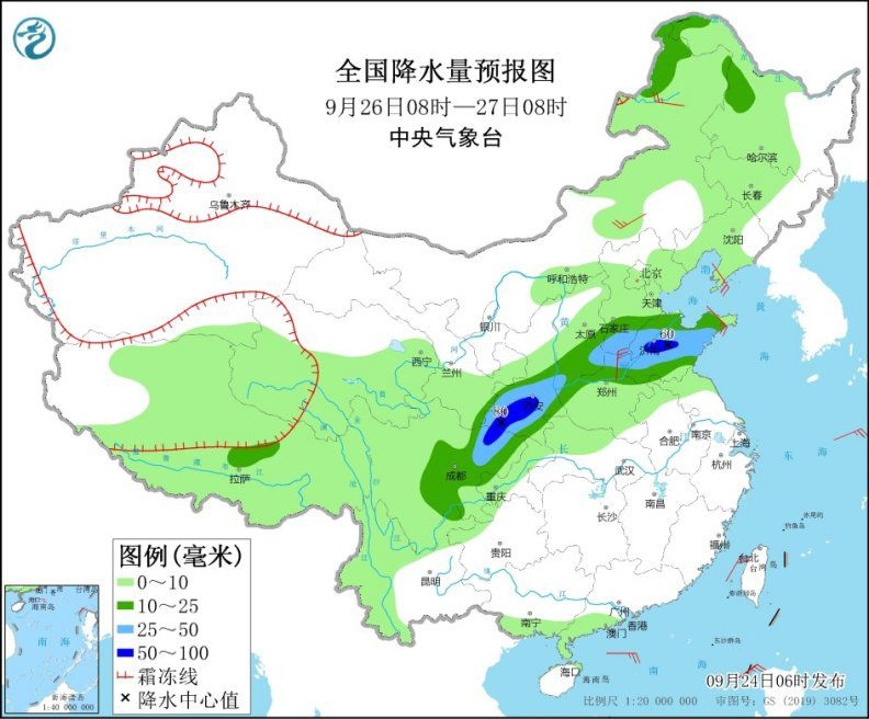 9月26日08時至27日08時,內(nèi)蒙古東北部、西北地區(qū)東南部、華北南部、黃淮、四川盆地北部等地部分地區(qū)有中到大雨,其中,陜西中南部、山東中部、四川盆地北部等地部分地區(qū)有暴雨(50~80毫米)。內(nèi)蒙古東部、遼東半島等地部分地區(qū)有4~5級風(fēng)。