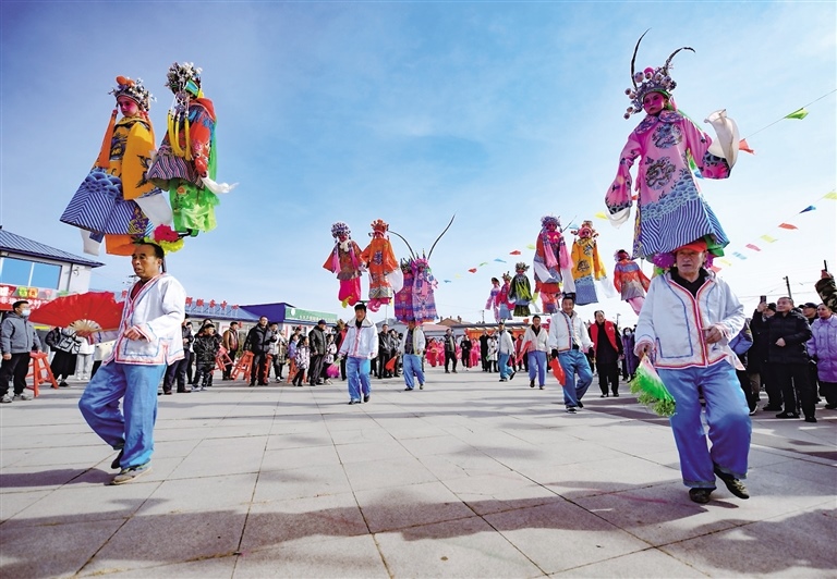2月14日,在呼和浩特市土左旗畢克齊鎮(zhèn)臘鋪村文化廣場上,秧歌扭起來,鑼鼓敲起來,腦閣也款款擺起來。腦閣是國家級非物質(zhì)文化遺產(chǎn),扛閣的人在行走中踏著鼓點(diǎn),通過身體搖動帶動架子上的孩子擺起來,極具觀賞性。(記者 鄭學(xué)良 通訊員 楊鑫 )