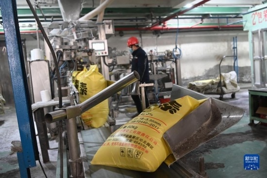 2月16日,在貴州省貴陽(yáng)市開陽(yáng)縣一家化肥生產(chǎn)企業(yè),工人駕駛叉車轉(zhuǎn)運(yùn)準(zhǔn)備外銷的化肥(無人機(jī)照片)。
