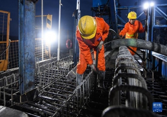 3月18日,在位于四川省瀘州市的渝昆高鐵瀘州沱江特大橋主跨合龍施工現(xiàn)場,施工人員在進行混凝土澆筑。