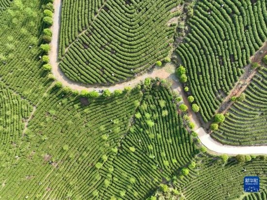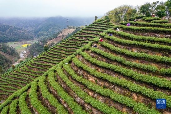 3月21日,在湖南省永州市江華瑤族自治縣橋市鄉(xiāng)大魚塘村,茶農(nóng)在茶園采茶(無人機(jī)照片)。