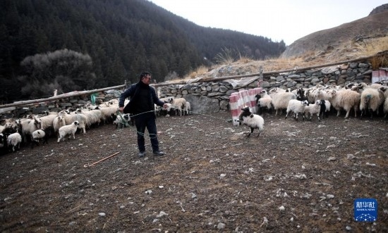 4月14日,在青海省海北藏族自治州剛察縣泉吉鄉(xiāng)寧夏村,牧民拉寶在自家羊圈中。