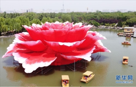 近日,在河南省洛陽市隋唐城遺址植物園,一座直徑36米、高13米的巨型牡丹景觀造型亮相滴翠湖,吸引游客前來觀賞。