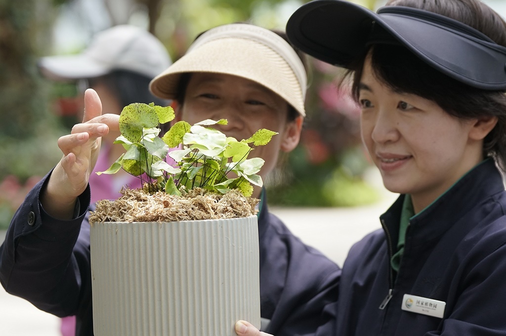 4月27日,國家植物園的植物專家在觀察荷葉鐵線蕨的生長情況。新華社記者 李欣 攝