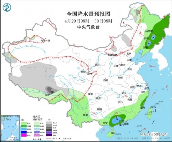4月29日08時(shí)至30日08時(shí),內(nèi)蒙古東北部、新疆南疆盆地西部、西藏大部、青海西部、川西高原南部等地部分地區(qū)有小雪或雨夾雪,其中,西藏東南部等地部分地區(qū)有中到大雪(5~8毫米)。東北地區(qū)大部、江南東部和南部、華南大部、臺灣島等地部分地區(qū)有小到中雨,其中,吉林東部、遼寧北部、廣西東部、廣東中西部等地部分地區(qū)有大雨(25~45毫米)。內(nèi)蒙古中北部、黑龍江東北部、青海東部、江西北部、貴州西南部、廣西東北部等地部分地區(qū)有4~6級風(fēng)。